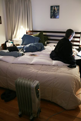 So, we are hunkered in our bedroom, having abandoned the rest of the house, which is a balmy 50 degrees. We only venture into the kitchen for hot tea or food, which we bring back to the bedroom. We have our trusty oil radiator heater on low, which warms up the room nicely, and if we keep the door closed, it's quite cozy. Everybody's in here, me and Terri and the kitties.